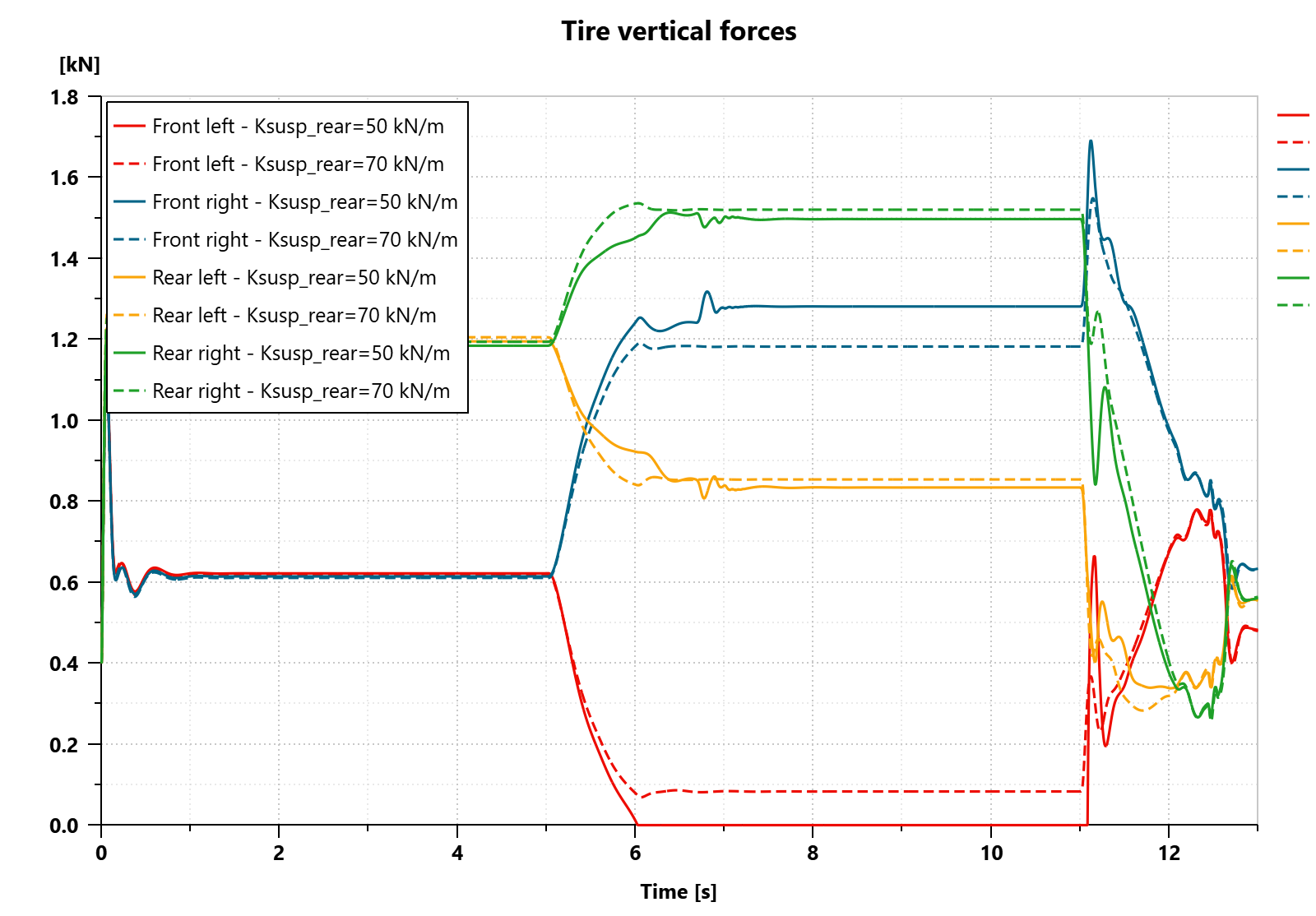 To closely examine the behavior of suspension and aerodynamics in one scenario, the maneuver analyzer is again utilized. The maneuver “Braking in a turn” is chosen, in which the vehicle first drives into a corner with a constant steering wheel angle and then hits the brakes while keeping the same steering angle. The following plot shows the vertical force on each tire for the given vehicle.