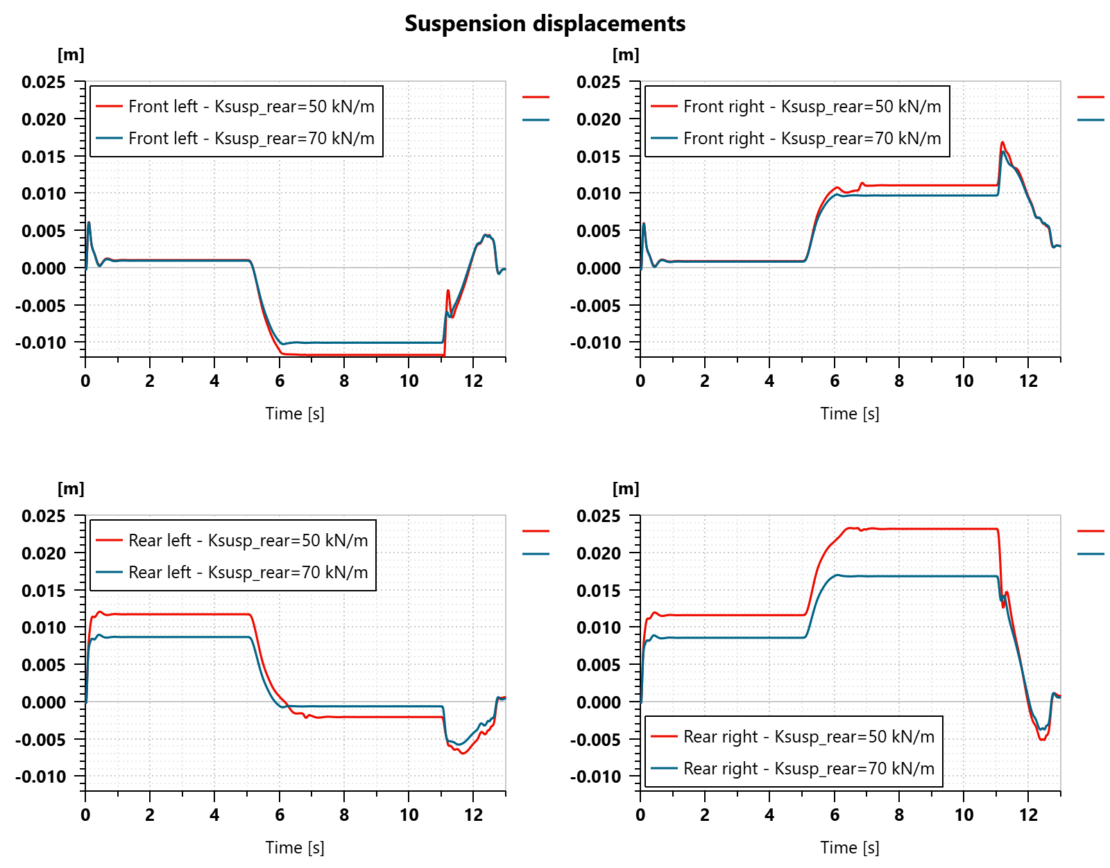 The front left tire has zero vertical force during the steady-state cornering (from 6 to 11 seconds) and then a large spike in its vertical force when the braking maneuver starts. This is not desirable, and to counteract this, the stiffness of the rear suspension is increased. The result can be seen in the dashed lines. By increasing the rear suspension stiffness, we were able to decrease the load transfer on the front axle, bringing the front left tire into firm contact with the ground again. Additionally, the suspension displacements are reduced, decreasing the roll and pitch angles, and thus keeping the car attitude in a better range for the aerodynamics.
