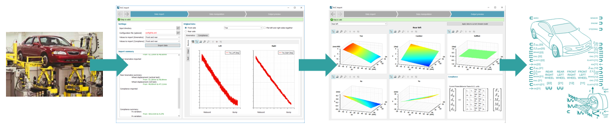 At a later point, when detailed vehicle dynamics analysis should be performed, the kinematic definition can be switched to the non-linear mode. This can be done in the same model, without changing any other subsystem, thus allowing for a seamless transition. The non-linear kinematics are defined using lookup tables, which can be created in Simcenter Amesim from test bench data, general kinematic parameters, or suspension hardpoint locations.