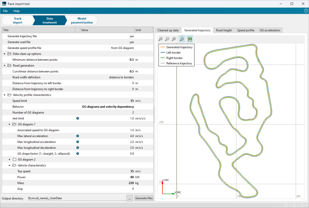 The track can be imported using the Track Import Tool, by supplying either a gpx or an XY data file, or utilizing the route planning function to import any major racetrack in the world. The velocity profile can be generated in Simcenter Amesim as well by supplying the G-G-V-diagram of the vehicle.