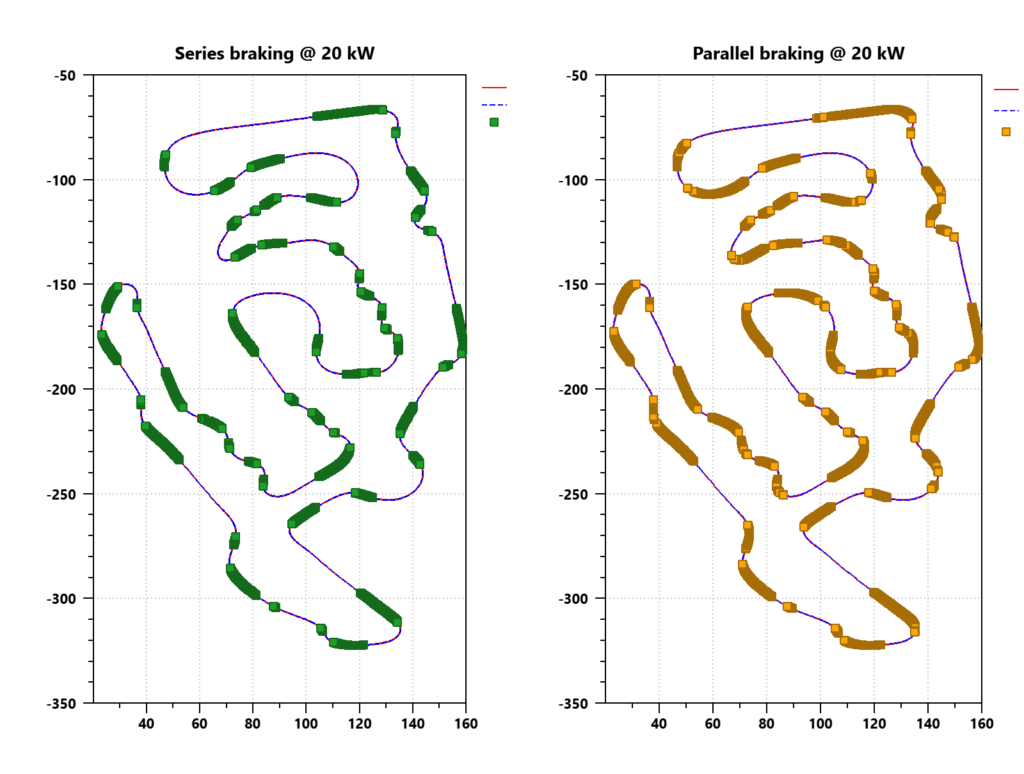 As expected, the higher the recuperation power, the less the battery is depleted. The braking strategy seems to have an even bigger impact on the state of charge. The following plot shows the sections on the track where the mechanical brake is being used for a recuperation power of 20 kW and series and parallel braking. As can be seen, the mechanical braking zones are larger for the parallel braking strategy.