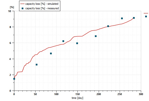 Figure 7 shows a comparison between the experimental and the simulated capacity losses. The simulated capacity loss shows good agreement with the experimental data.