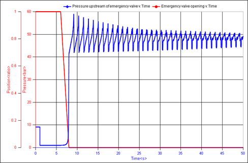 The model and results above represent a pipe network that transports fluids. When opening or closing one of the emergency valves (red line), a pressure wave (blue line) propagates through the network causing forces and vibrations that potentially damage the mechanical structure. Read more about this application in this customer testimonial.