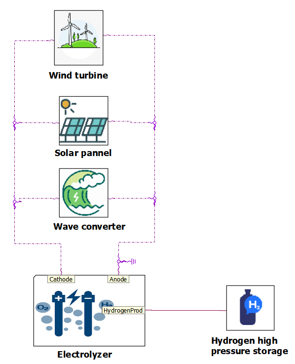 The model below includes a combination of different energy sources producing electric power which is needed for hydrogen production. There’s a subsystem behind each component in the model that describes the wind turbine, the solar panel, the wave converter, the electrolyzer and the hydrogen storage under high pressure. With the connection between the component the transfer of energy is simulated, making it possible to predict interactions between subsystems and the performance of the global system.