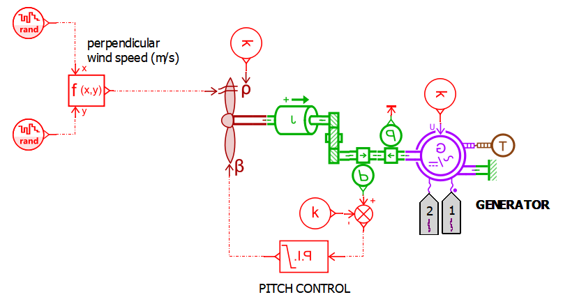 Wind turbine model to define diameter, pitch angle and other turbine parameters to estimate the generator performances, subcomponents losses and fan pitch control.