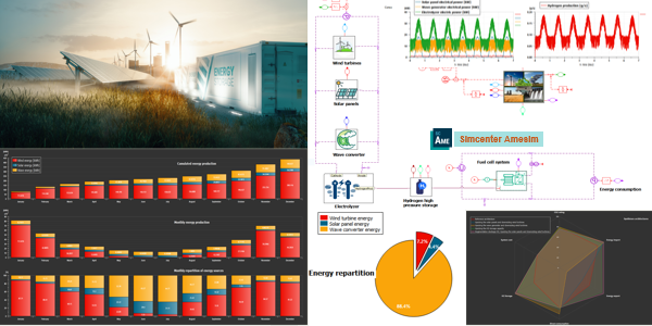 ♻️⚡🔌 You can also go more at the electrics side, with this digital twin of a green hydrogen-based microgrid. The goal is to optimize the global system efficiency considering thermal management. You can check your power mix (solar, electrolyzer, fuel, cell, battery, …) over months. To finally verify that it’s compatible with the electric load, and that it can be supplied properly to the grid.