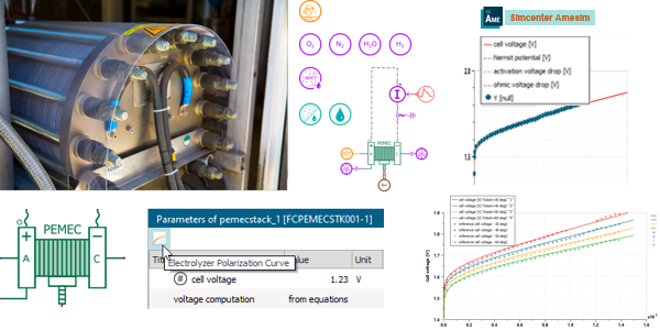 To simulate the production of hydrogen, i.e. the conversion of the green electricity into hydrogen in Simcenter Amesim, the Proton Exchange Membrane electrolyzers (PEMEC) or reversible Solid Oxide Cell (rSOC) capable of operating either as a fuel cell (SOFC) or as an electrolyzer (SOEC), include predictive models based on electrochemical equations together with dedicated polarization apps.