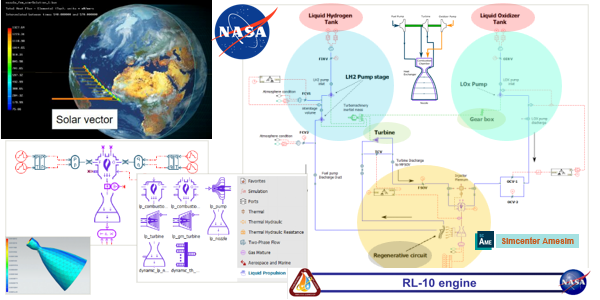 The RL10A-3-3A engine is modeled using the Liquid Propulsion library in Simcenter Amesim software. The Liquid Propulsion library consists of a set of specific components for cryogenic engines as pump, turbine, combustion chamber and nozzle. This library is an extension of the Two-Phase Flow and Gas Mixture libraries, which addresses the physical phenomena linked to dynamic gas mixture, combustion and phase change transition (supercritical, boiling, condensation…). Components from other libraries such as shafts, accounting for mechanical dynamics, gearboxes, electrical generators, heat exchangers can be combined with this library components to allow the modelling of any rocket engine configuration and any integrated systems.