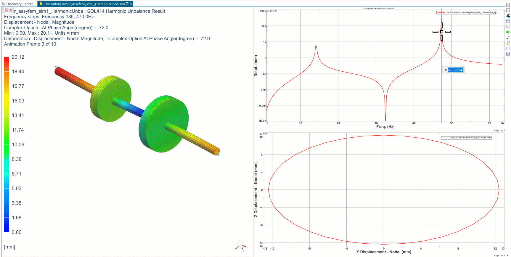 In the animation below, the FRFs (top right) represent the evolution of the magnitude of the displacement of the smaller disk’s center, in a frequency range from 1 to 65 Hz, for the unbalanced rotor. Resonance is found for 2 frequencies, around 14Hz and 47Hz. At 47 Hz, the animation of the deformed shape is presented (left), and the movement of the center of the smaller disk, at a frequency of 47Hz, is represented (bottom right).