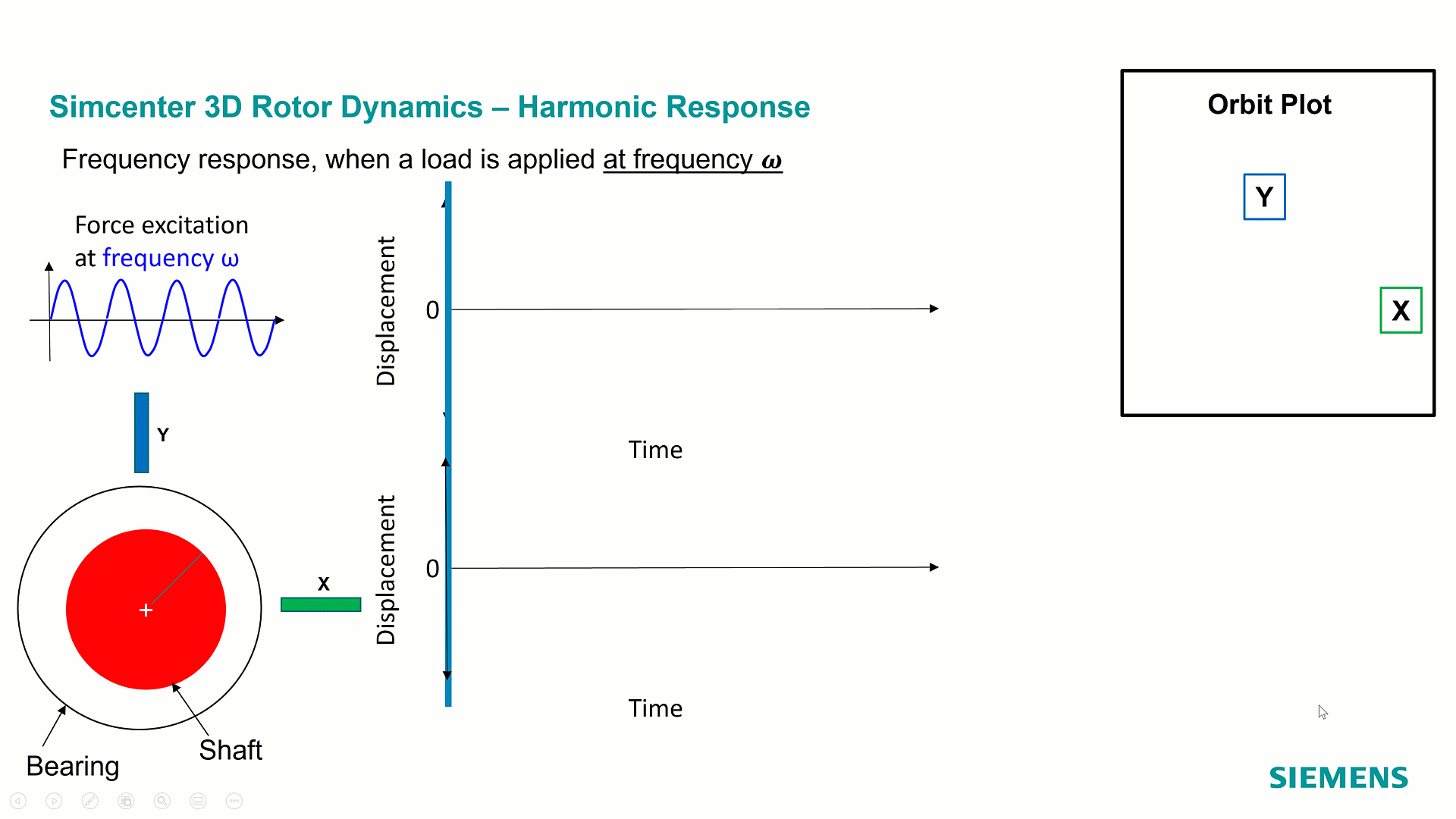 In Harmonic response, the simulation is computed in a range of frequencies. In some cases, the frequency corresponds to the rotation speed of the rotor, we are then referring to synchronous analysis. In other cases, the excitation frequency is different from the rotation speed of the rotor, referred to as asynchronous analysis. As a result of this analysis, we monitor quantities like displacements, forces, stresses, as function of frequency, what we also call Frequency Response Functions FRFs. Each point of the Frequency response function corresponds to a specific frequency response. The results of harmonic response are complex numbers: they make it possible to represent the system behavior over a full cycle as depicted on the above orbit plot.
