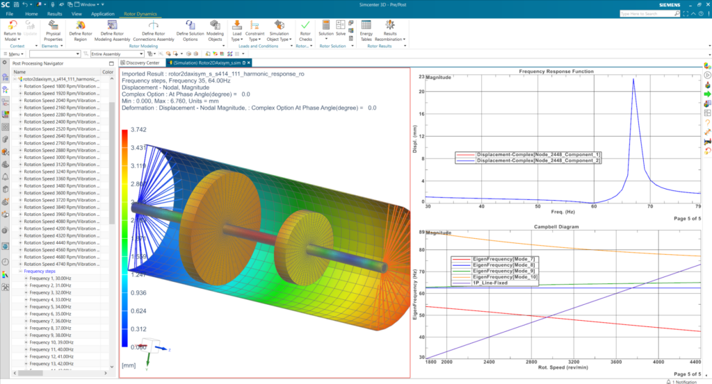 Simcenter 3D includes dedicated tools to complete all the steps in the process. Those include specific functionalities rotor dynamics engineers would need to apply realistic boundary conditions, to effectively prepare geometries and perform meshing, to do more efficient calculations and to get more insightful post-processing.