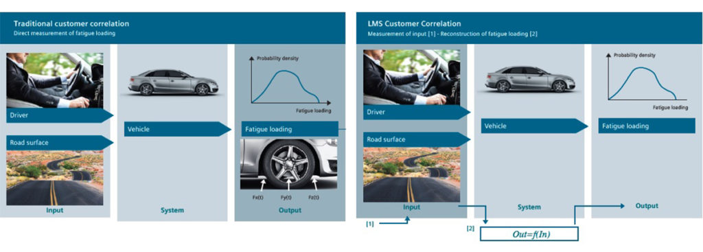 Let’s take durability target setting. Traditionally, durability targets are based on realistic load data from public roads or proving ground. One specific vehicle is instrumented with a lot of channels and intensively measured over a couple of weeks. No need to say that this is time consuming and expensive. But also the customer relevance of such tests is very limited, since only one vehicle is measured. So, how do you engineer for a bumpy, washed-out road – and at the same time for a brand new eight-lane highway?