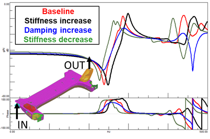 To evaluate the subframe, we test three different modifications: increasing stiffness, increasing damping, and reducing stiffness.