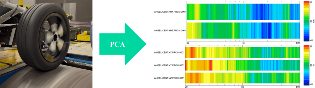 To determine the tire wheel blocked forces, the in-situ TPA method is employed. In many cases, Principal Component Analysis (PCA) is then applied to each indicator cross-power matrix. This decomposition technique allows for the identification of different excitation phenomena and enables the analysis of operational indicator response spectra per principal component.