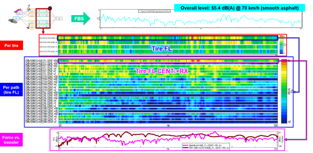 The driver’s ear pressure is decomposed into partial contributions per tire-wheel, with the front-left tire-wheel identified as the dominant component. Further decomposition into partial contributions per path for the front-left tire-wheel shows that the direct RX DOF is the dominant path. Analyzing the assembly contact forces and transfer FRFs in this path reveals that high force levels overlap with relatively high transfer sensitivities in the problematic 300-400 Hz range.