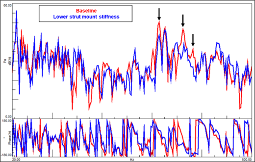Next, we turn our attention to the front strut mount. By reducing its rotational stiffness, we investigate the impact on the driver’s ear sound pressure levels. We see that this modification not only significantly reduces one of the target peaks but also improves some higher frequency peaks.
