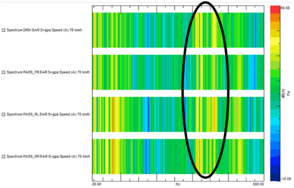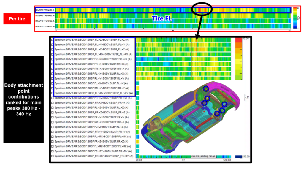 Digging deeper, the noise contributions from individual body attachment points are ranked. It becomes evident that the forces exciting the front of the vehicle are the main cause of the peaks of interest. Both the subframe attachment points and the direct suspension strut mounts to the body have a significant impact on road noise.