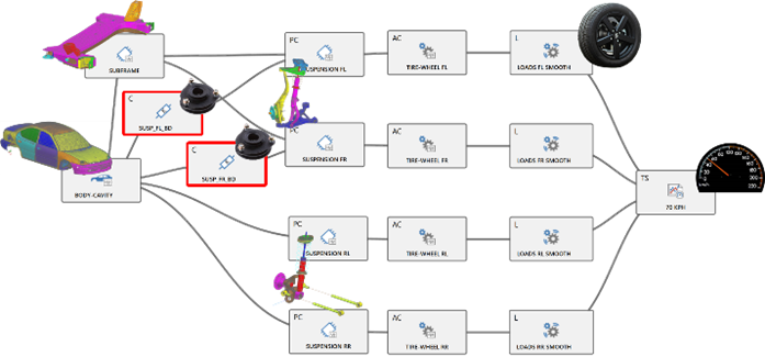 With this workflow, we have the ability to rapidly test various alternatives within a matter of minutes. By making rather large changes to components (stiffness, damping, …), we can immediately assess if the component will impact the results. The efficient overall workflow allows to screen a large number of variants in a short time.