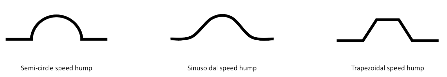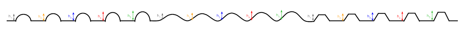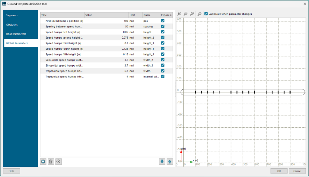 For each speed bump type, 5 different heights are tested: h1 = 5 cm, h2 = 7.5 cm, h3 = 10 cm, h4 = 12.5 cm and h5 = 15 cm. This test ground is then created in Simcenter Amesim using the embedded ground designer app.