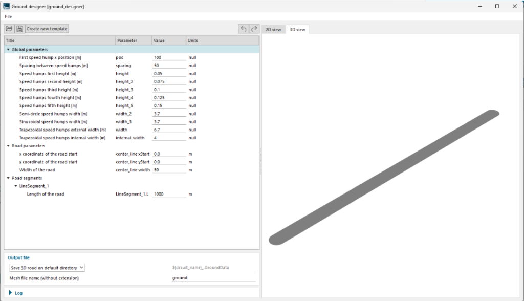 The test ground is generated using the Ground Designer tool and the battery pack of the skateboard platform is meshed using mesh-sphere contact submodels. Speed bumps are increasingly used to ensure low speeds in urban areas. Depending on the country, they have many shapes, heights and widths; several standards exist and are more or less respected. The test ground used in this demo includes 3 types of speed bumps: