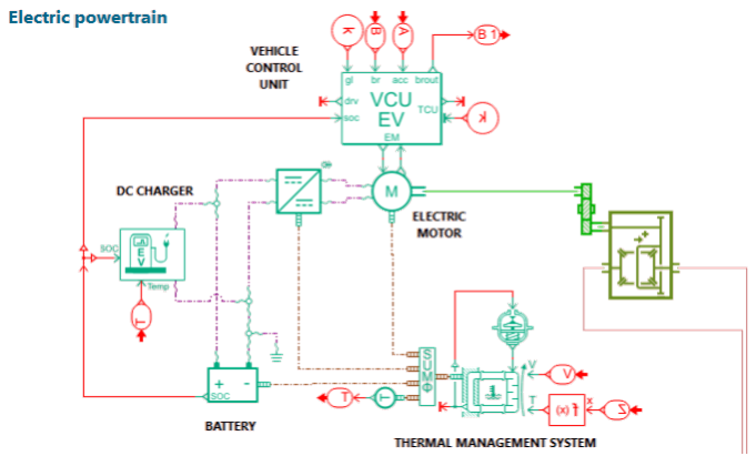 The electric powertrain is modeled using the IFP Drive library and the chassis model uses mainly the vehicle dynamics library components.
