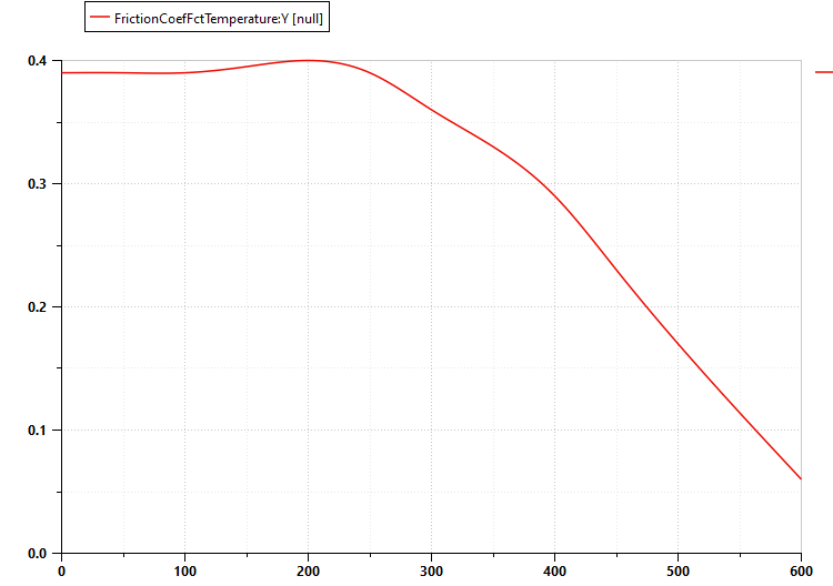 This model includes a VCU, the electric motor, the battery system, a charger and a simple thermal model of the battery and its cooling system. The braking system includes a simple hydraulic system and a basic thermal model. The friction coefficient is calculated as a function of disc temperature using the following table: