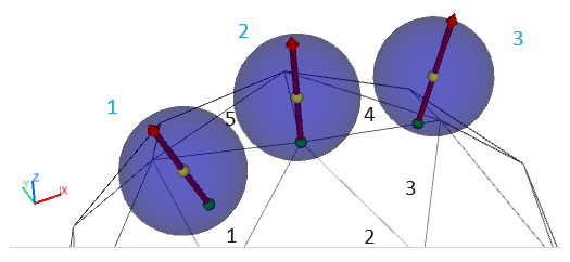 The contact detection uses the (BVH) Bounding Volume Hierarchy approach. The first contact detection is at the (BV) Bounding Volume level. If a contact appears between the BV of the sphere and the end BV of the BVH, a contact detection is computed between the sphere and the triangle inside the end BV. The next picture shows 3 spheres in contact with one or several triangles.