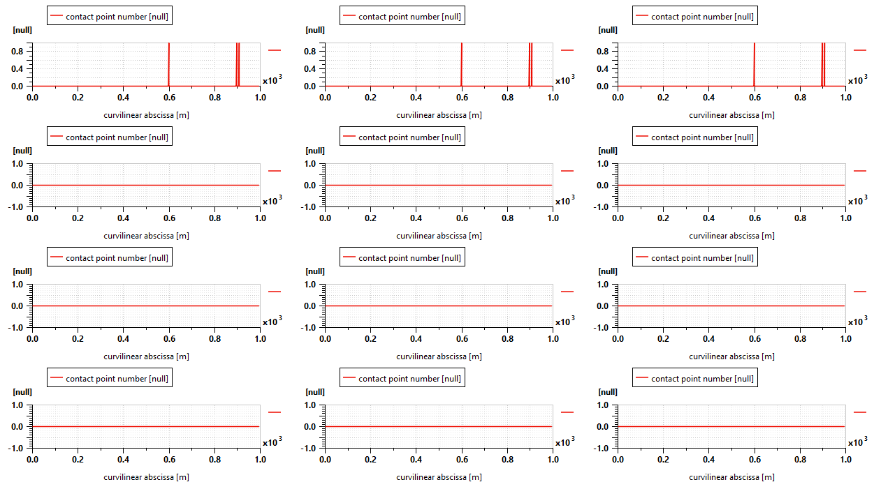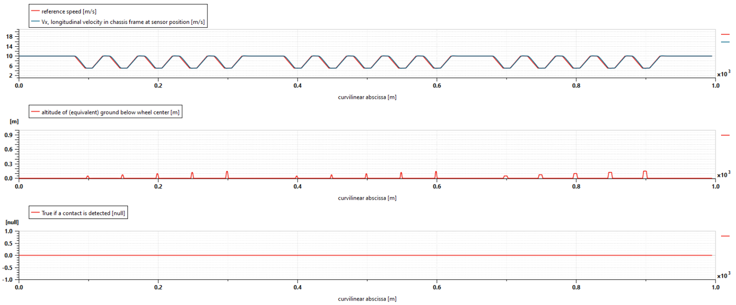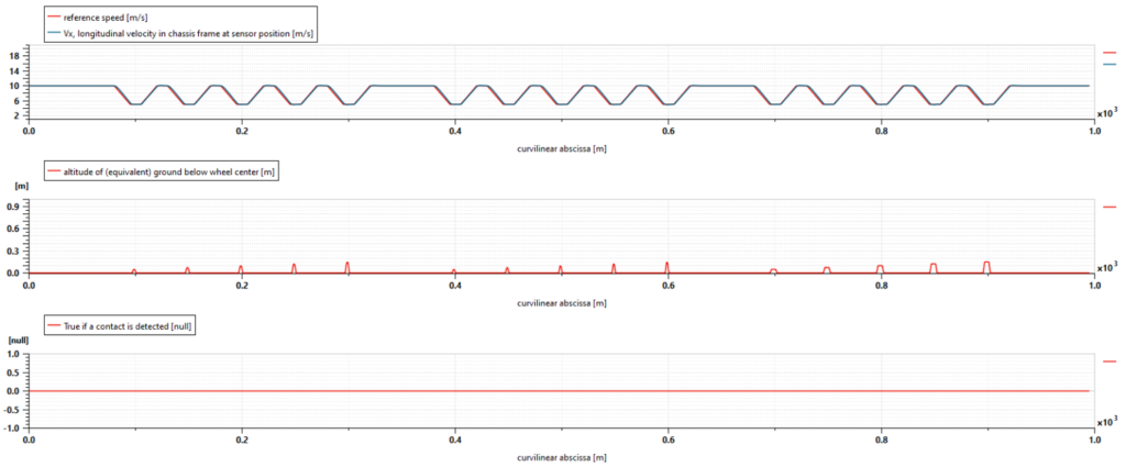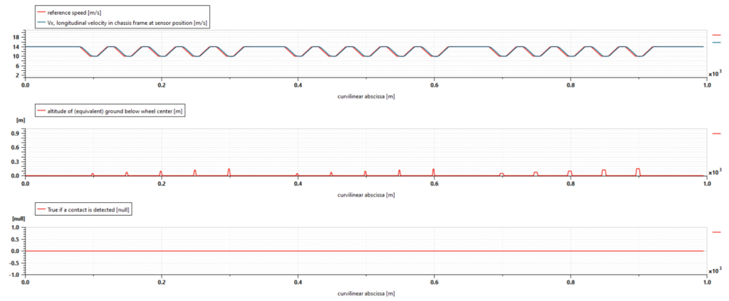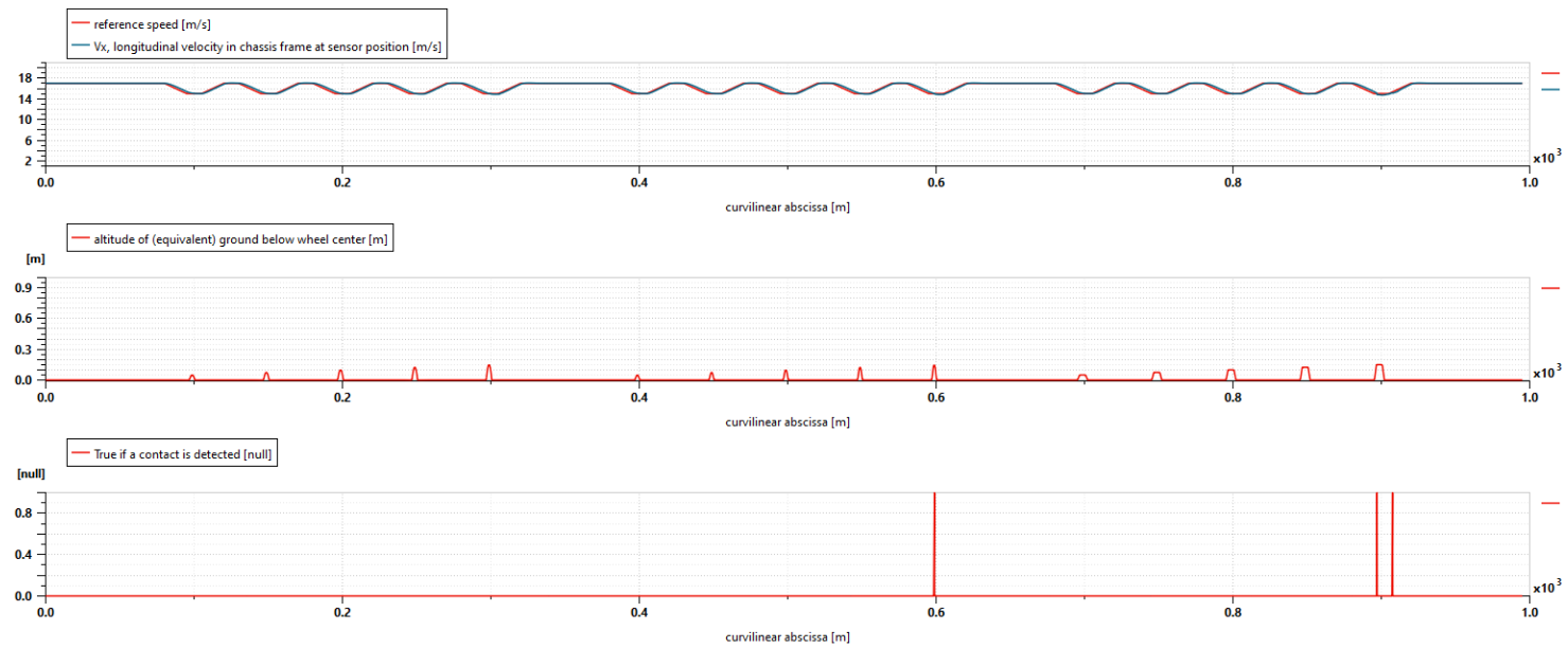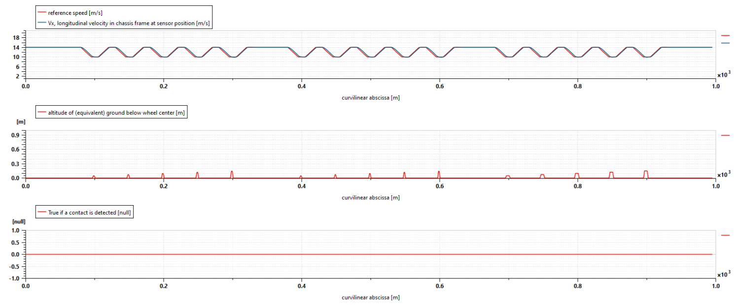 Several plots are created to study the behavior of the vehicle. The mesh-sphere contact submodels include a “contact point number” variable which can be used to monitor the occurrence of a contact. By summing this variable for all contacts, it is easy to detect whether the battery has hit the ground, as the sum will be greater than 0. For low speed and normal speeds, one can observe that the battery doesn’t touch the ground. By contrast, when speed exceeds 50 km/h or 30 mph, i.e. the usual speed limits in urban areas for many countries, one can observe that some contacts are detected while driving on the highest speedbumps.
