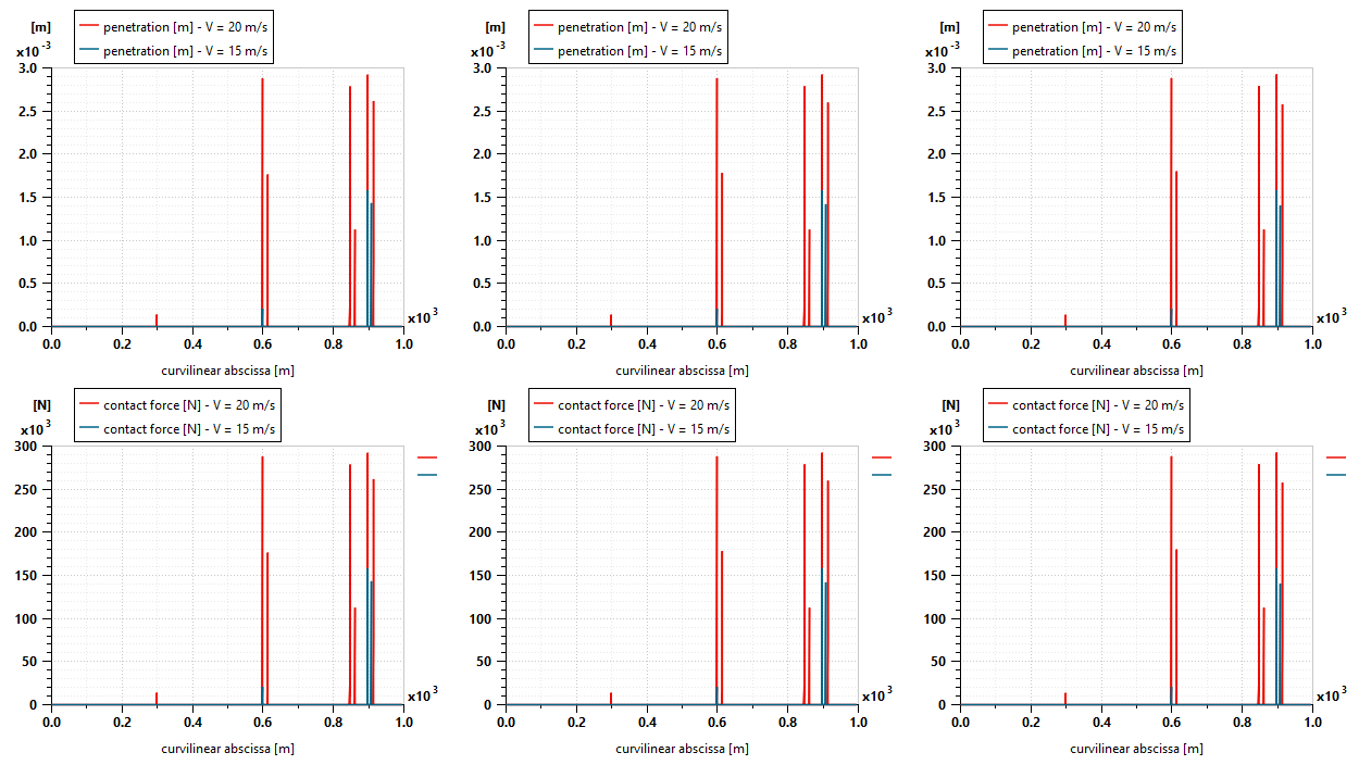 Finally, the mesh-sphere contact submodel enables the estimate of contact force and penetration during the impact in order to determine whether the battery pack would be severely damaged, as well as to size reinforcement plates. As an example, here is a comparison of penetration and force on the front of the battery pack between 15 m/s (in blue) and 20 m/s (in red).