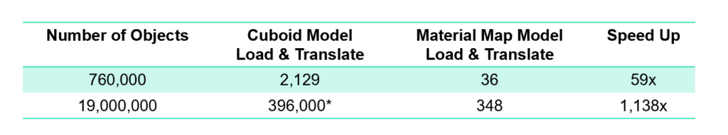 The Material Map SmartPart computational efficiency is reflected in model loading and translation time when compared to typical explicit modeling of geometry and materials. Below are 2 examples of the indicated faster loading and translation processes in the order of 10 times or to over 1000 times faster , which can positively impact overall analysis processing time.