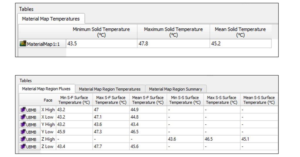 For a material map SmartPart there are tabular temperatures available. For individual regions fluxes and temperatures are in tabulated form.