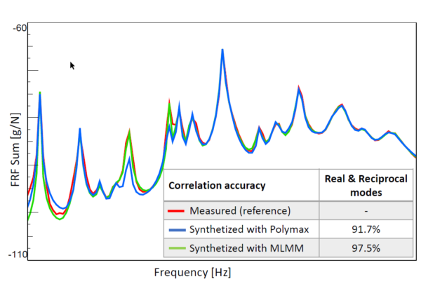 Not only that, MLMM brings extra accuracy in terms of resonant frequency and damping estimates and accelerates processing tasks when dealing with a higher level of complexity of measured structures, allowing non-expert users to deliver more consistent data. The improvement of the modal model accuracy with the MLMM algorithm is especially remarkable when constraints, such as reciprocity or non-complexity, are imposed on the modes in view of finite element model correlation.