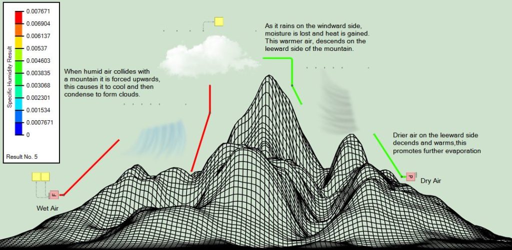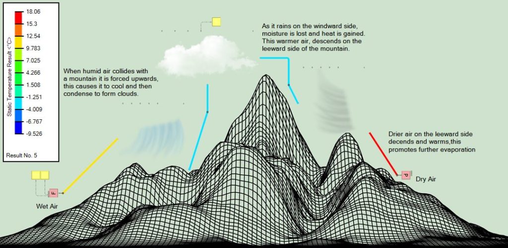The image above shows the wet air on the left (windward side) that is forced up the mountain, this causes it to cool and then condense to form clouds. This then causes it to rain which results in moisture being lost and a gain in heat. This warmer air descends on the leeward side and promotes evaporation. This image only tells half the story though as we can’t see the humidity change.