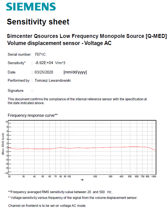 The calibration certificate of Qsources reports the averaged RMS calibration value for the frequency range specified. The final user needs this value to perform FRF measurements. Figure 1 below reports an example of a calibration certificate for Qsources noise source Q-MED. The Q-MED source has an RMS sensitivity of -8.92E+04 V/m3 averaged over the frequency range 20-500 Hz. The same certificate also reports the frequency response curve of the instrument in dB scale. The reference to obtain the dB value is the sensitivity in the same spreadsheet -8.92E+04 V/m3. The frequency response curve graphic in Figure 1 shows the one-third octave band values in dB scale. While the calibration spreadsheet in the Excel table in Figure 2 reports linear sensitivity values in one-third octave bands. The frequency response curve of the Q-MED shows that the instrument sensitivity has mainly a flat trend in frequency domain. However, the sensitivity response curve of Qsources can be useful to obtain a more precise FRF amplitude as explained later.
