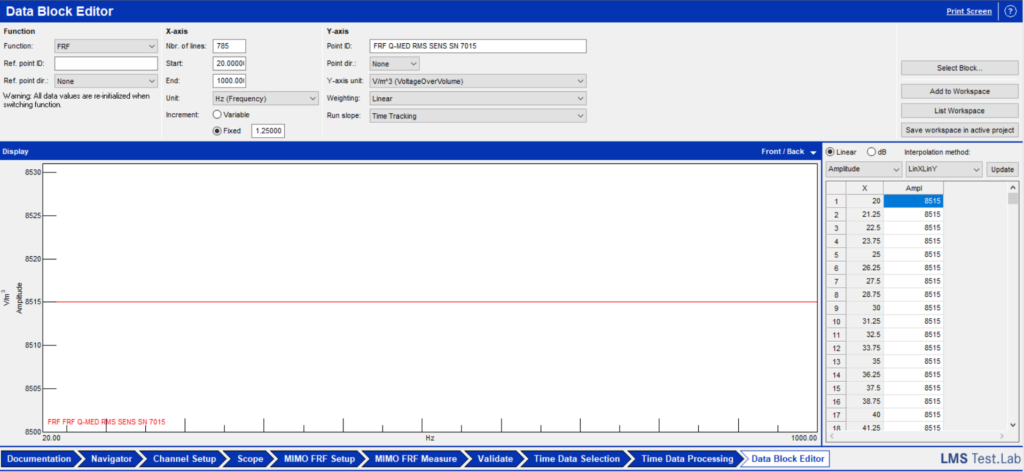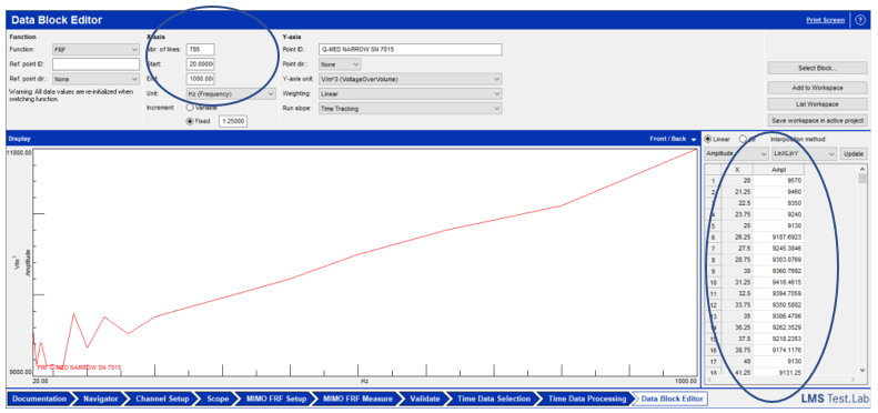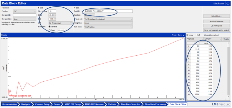 The Frequency Response Function of the Q-MED shall be inserted in the Data Block Editor in one-third octave band format first (Figure 7). Then the user shall convert in narrowband (same frequency lines as the acoustic measured FRF) with the interpolation method (Figure 8).