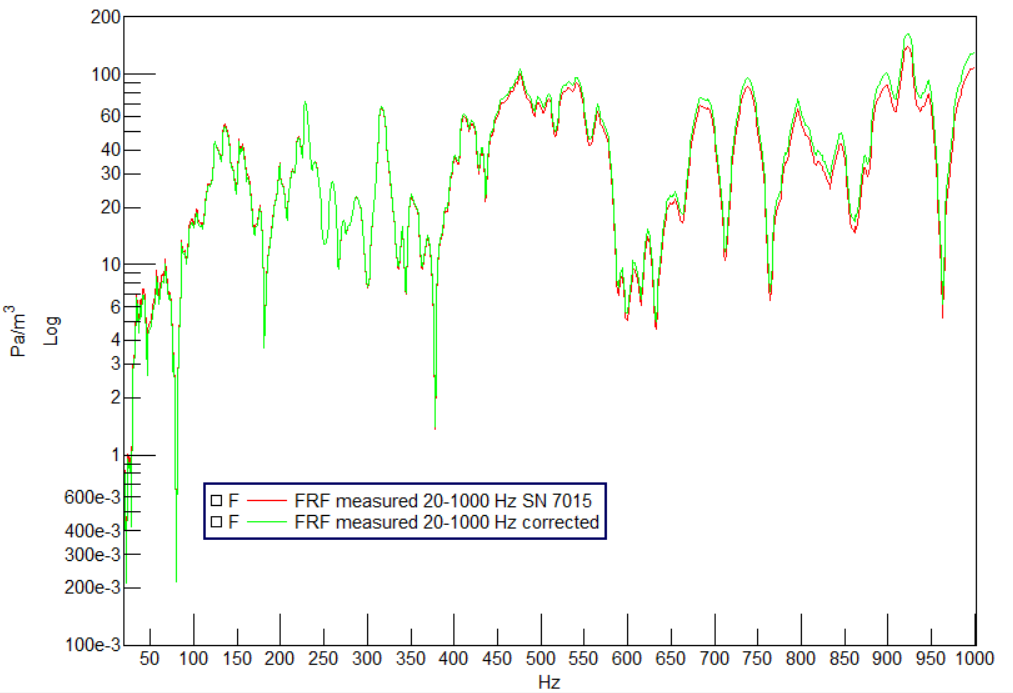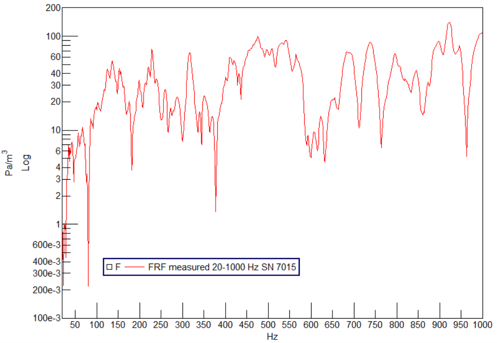 The frequency response function of the instrument V/m3 reported below in Figure 5 shall be converted to narrowband values to be compared with the measured FRF in Figure 3.