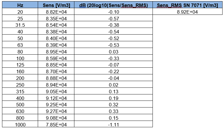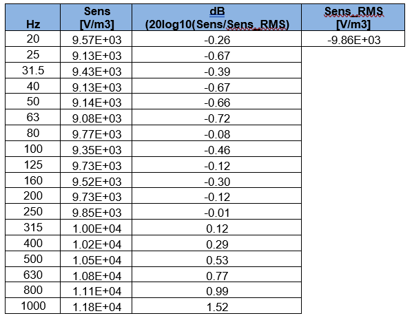 The Excel table below (attached to the calibration factsheet) reports the sensitivity values for the Q-MED in one-third octave bands. The dB value in Figure 1 is obtained from the sensitivity value in the one-third octave band and averaged RMS sensitivity as the dB reference (Figure 2).