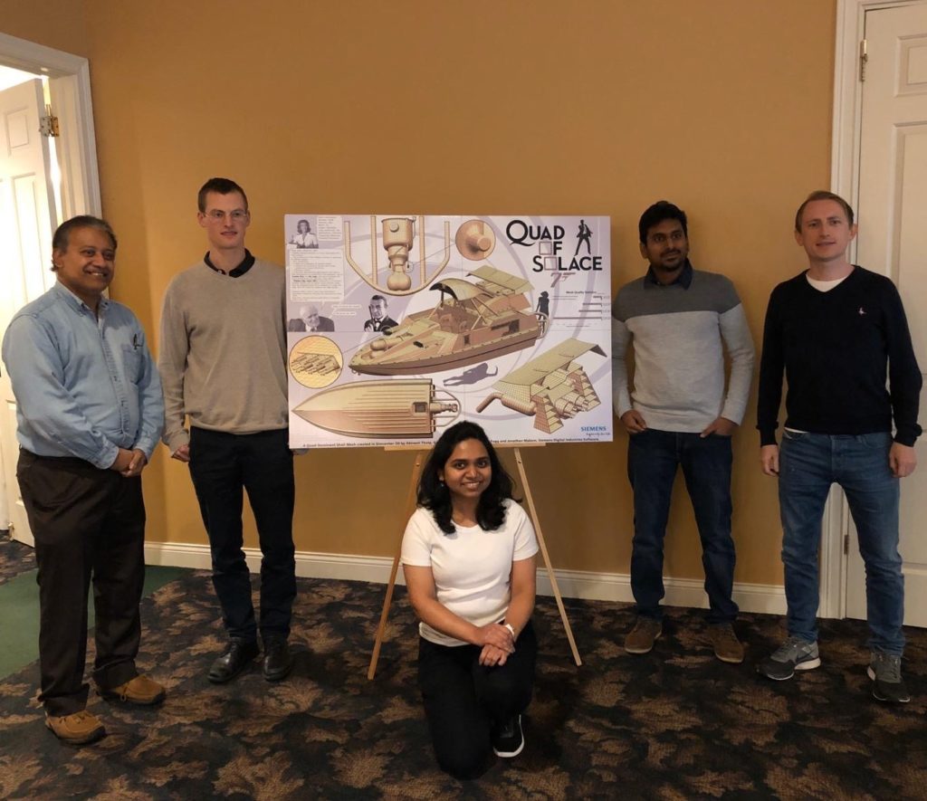 Figure 3: The winning Siemens team, from left to right: Debashis Basu, Harry Fogg, Gargi Patil, Abinesh Thota, and Jonathan Makem. Harry and Jonathan are from the Cambridge (UK) office and Debashis, Gargi and Abinesh are located in the Milford, Ohio (US) office.