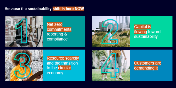 Sustainability has evolved from being a choice or a marketing strategy to becoming a fundamental requirement for businesses. The sustainability shift is here NOW. Customers, investors, and regulators demand transparency and accountability from companies when it comes to their environmental impact. A quick glance at the government agenda and fortune 500 companies’ website reveals the sustainability agenda importance: “net zero commitments”, the “capital flow”, the “resource scarcity” and the “circular economy”.