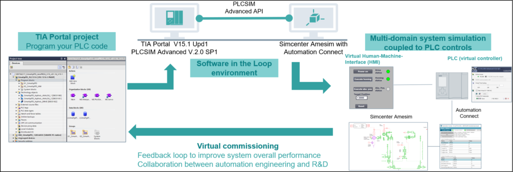 Another major challenge in robotics engineering is the development and validation of control logics used in PLCs and human machine interface (HMI). The automation and controls department procrastinate software validation until the availability of a prototype. Utilizing Simcenter Amesim virtual commissioning feature, controls engineers can evaluate the accuracy of logics, the machine cycle time and the acceleration/ deceleration profiles coupling PLC controls in the digital environment. The customer benefit is the reduction of the virtual commissioning phase using reliable virtual prototypes, in a risk-free environment.