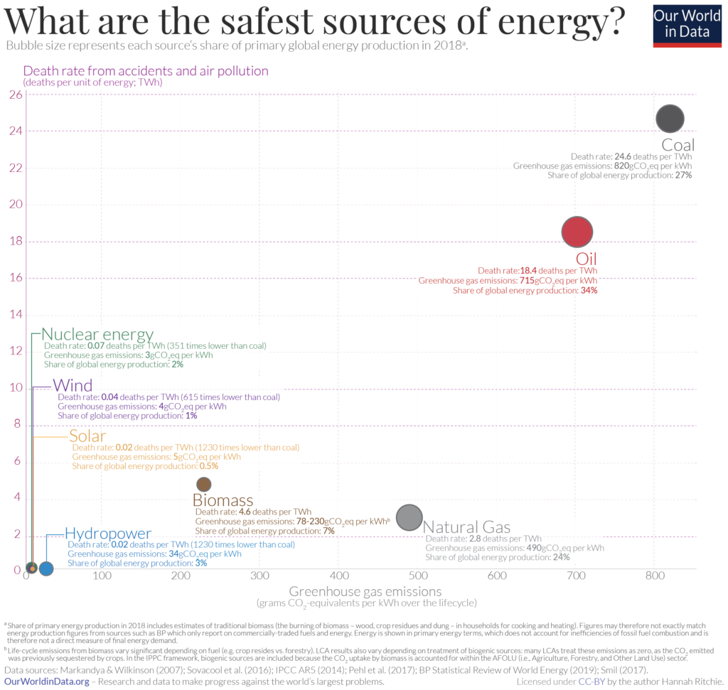 There is, of course, another axis to this discussion. We also need to consider the safety of the planet, and the potential risk to our descendants as a consequence of human-made climate change. This chart combines the data above with the greenhouse gas emissions that result from a particular energy source:
