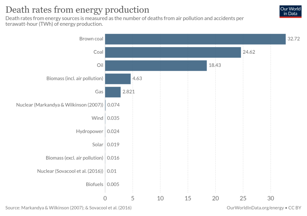 Even if you do not agree with the nuclear casualty numbers used to produce these estimates (and by most accounts, they are very conservative) since nuclear power contributes 2500 TWh of baseload electricity generation across the world every year, the casualties would have to be orders of magnitudes higher to be comparable with deaths caused by coal or oil.