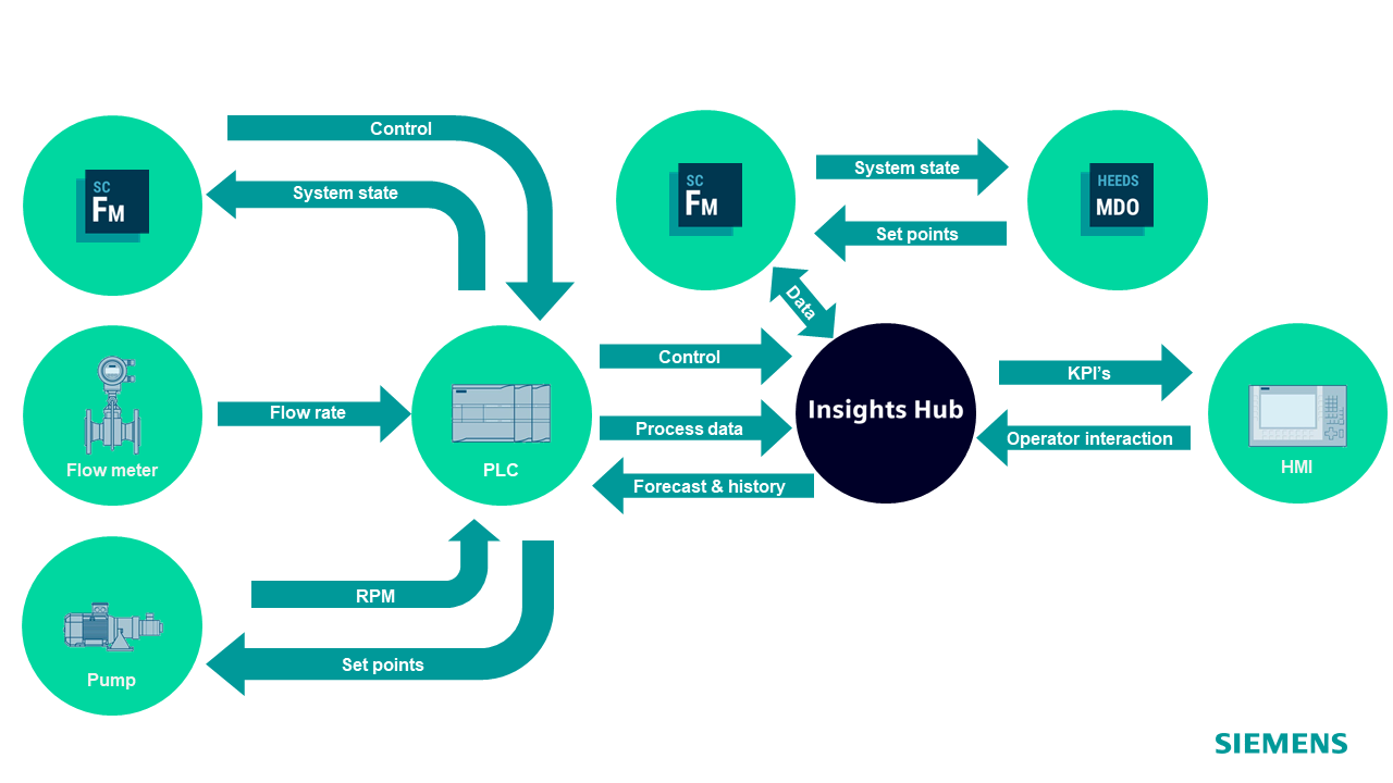 • Siemens Insights Hub is the industrial IoT platform, capable of storing data and interfacing with data, the model and the physical pumping station.