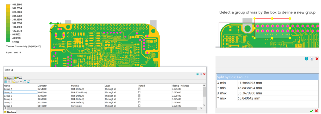 Via filler material can be set for a group of vias. Vias are grouped by their diameter and their type that can be either through hole, blind or buried via. In addition, you can select a subgroup within a group by a rectangular box and define separate filler material for the subgroup. Also, you can disable plating for the group of vias.