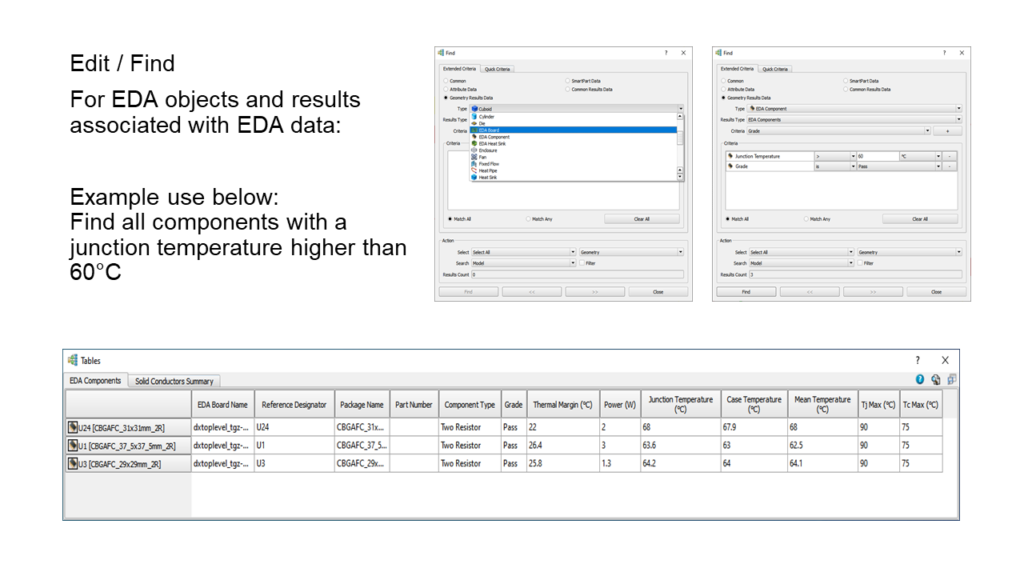 Additionally, updated find/replace capabilities allow quick location of common information in tabular format and also provides another way to quickly identify results of interest e.g to find all components have a junction temperature result above a set value.