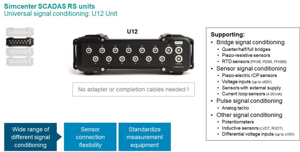 Enter the Simcenter SCADAS RS U12 unit! This unit embeds a complete range of different signal conditioning in one single, compact unit, enabling total channel flexibility with a limited hardware footprint.