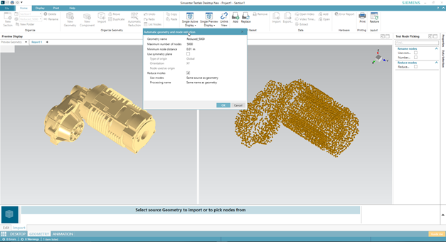 To solve this issue, we decided to develop new functionality to automatically reduce a large model before importing it into Simcenter Testlab by simply defining the maximum number of nodes and the minimum distance between them. Models with millions of nodes can be efficiently reduced by more than an order of magnitude without practically losing any interesting information. And on top of keeping the nodes, you can also reduce a mode set if it is part of the original geometry. Thanks to this, modal expansion, comparison of shapes, or the recently introduced node picking can be done much more efficiently.