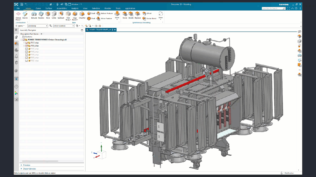 Power transformer design CAD import showing the different components including radiators, fans, tank, connection box, conservator etc, in Simcenter 3D