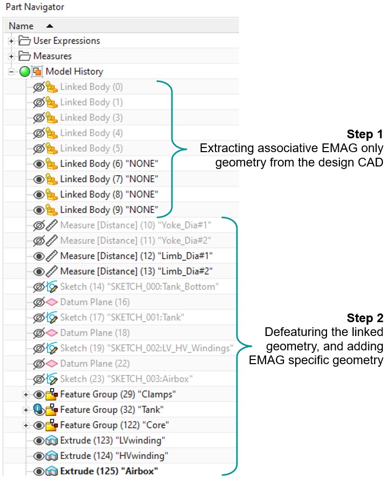 Figure 2 animates the process, which can be broken down into steps as seen in the model history. That is, extracting an associative EMAG geometry from the design CAD in the first step, and then defeaturing and adding EMAG-specific geometry like the explicit turns and airbox in the second step.