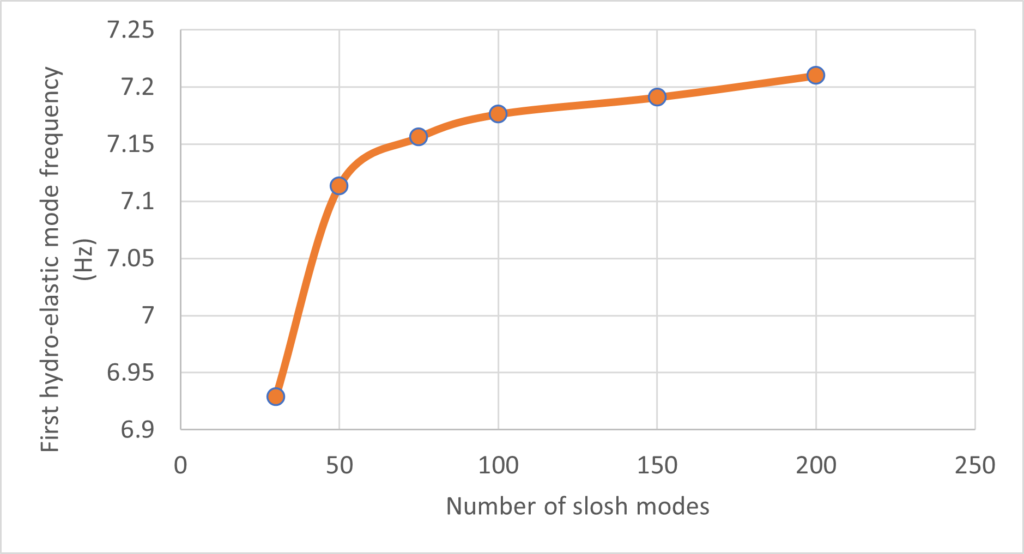 Linear dynamic analyses result in 204 slosh modes – identical to the number of nodes on the surface of the fluid domain. The total elapsed time to compute the first 30 modes is about 60 seconds, and the first 300 modes (204 slosh modes + 96 hydro-elastic modes) was around 15 minutes. These run times are small enough to perform a plethora of what-if studies.